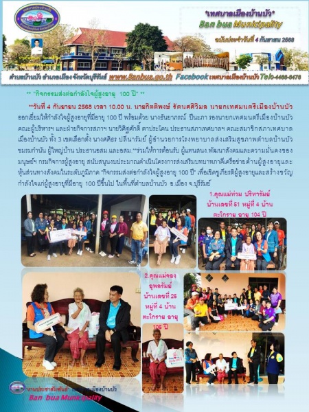 **วันที่ 4 กันยายน 2568 เวลา 10.00 น. นายกิตติพงษ์ รัตนศศิวิมล นายกเทศมนตรีเมืองบ้านบัว ออกเยี่ยมให้กำลังใจผู้สูงอายุที่มีอายุ 100 ปี พร้อมด้วย นางธันยาภรณ์ ปีนะภา รองนายกเทศมนตรีเมืองบ้านบัว คณะผู้บริหารฯ และฝ่ายกิจการสภาฯ นายวิศิฐศักดิ์ ตาประโคน ประธานสภาเทศบาลฯ คณะสมาชิกสภาเทศบาลเมืองบ้านบัว ทั้ง 3 เขตเลือกตั้ง นางศศิธร ปลีนารัมย์ ผู้อำนวยการโรงพยาบาลส่งเสริมสุขภาพตำบลบ้านบัว ชมรมกำนัน ผู้ใหญ่บ้าน ประธานอสม.และอสม.