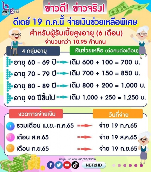 ข่าวดี ข่าวจริง ดีเดย์ 19 ก.ค.นี้ เริ่มจ่ายเงินช่วยเหลือพิเศษผู้สูงอายุ (6 เดือน) จำนวนกว่า 10.95 ล้านคน