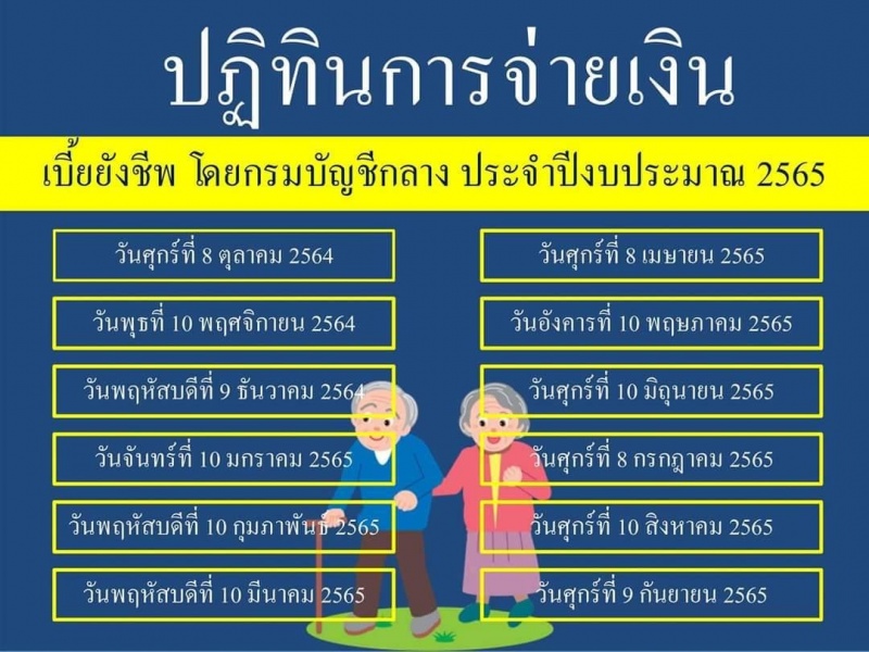แจ้งประชาสัมพันธ์ ปฏิทินการจ่ายเงินเบี้ยยังชีพฯ โดยกรมบัญชีกลาง ประจำปีงบประมาณ 2565 |