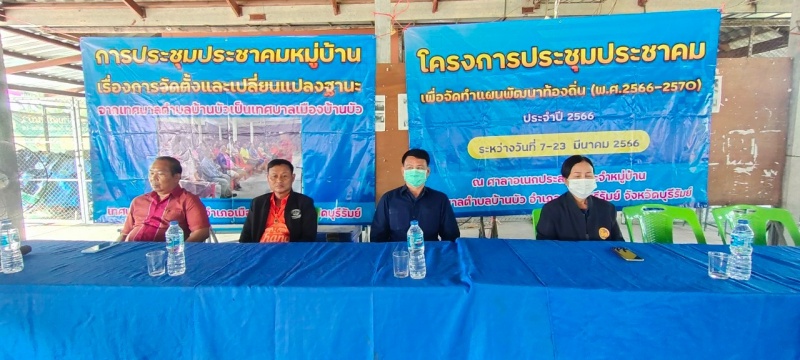 เทศบาลตำบลบ้านบัวจัดประชุมประชาคมท้องถิ่น เพื่อให้เกิดกระบวนการมีส่วนร่วมของประชาชน ได่แสดงความคิดเห็น ข้อซักถาม ข้อเสนอแนะ ปัญหาต่างๆที่เกิดขึ้นในชุมชน รวบรวมนำมาเพื่อสู่การแก้ไข ในการจัดทำแผนพัฒนาท้องทิ่นเทศบาลตำบลบ้านบัว(พ.ศ.2566-2570)ประจำปี 2566 โดยกำหนดออกประชุมประชาคมระหว่างวันที่ 7 - 23 มีนาคม 2566 ทุกชุมชน